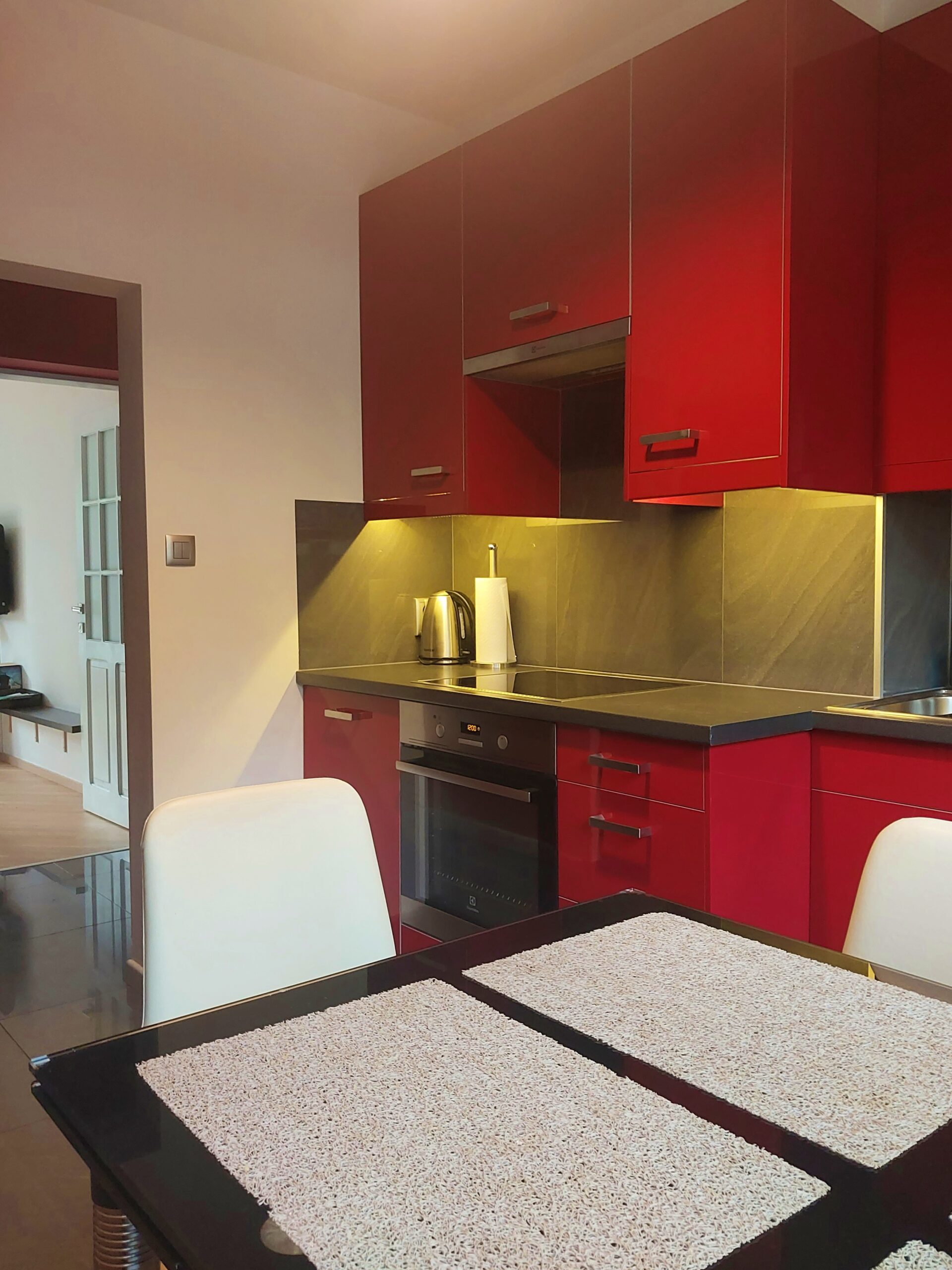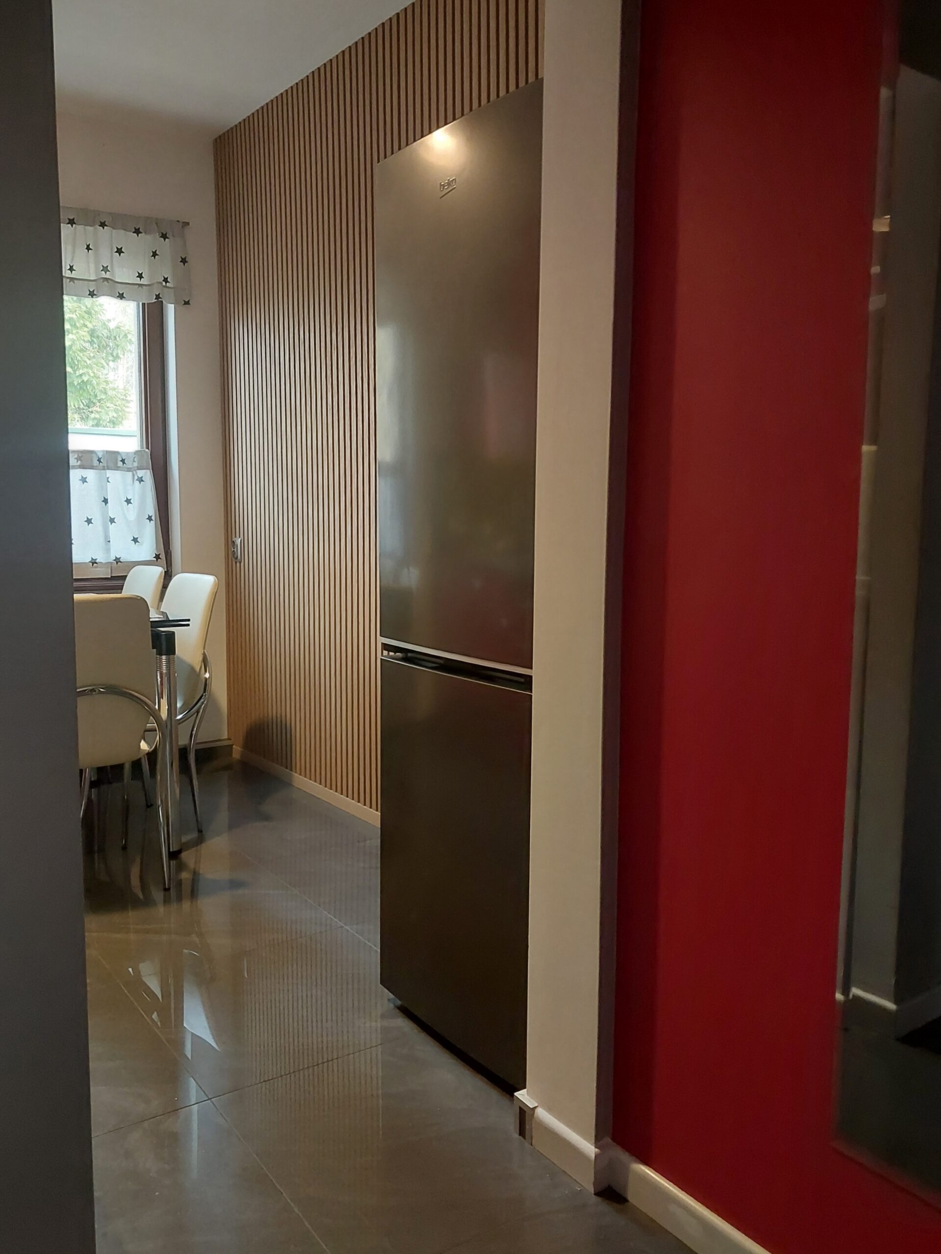 - lodówka, czajnik bezprzewodowy, kuchnia ceramiczna z piekarnikiem, zestaw naczyń i sprzętów kuchennych